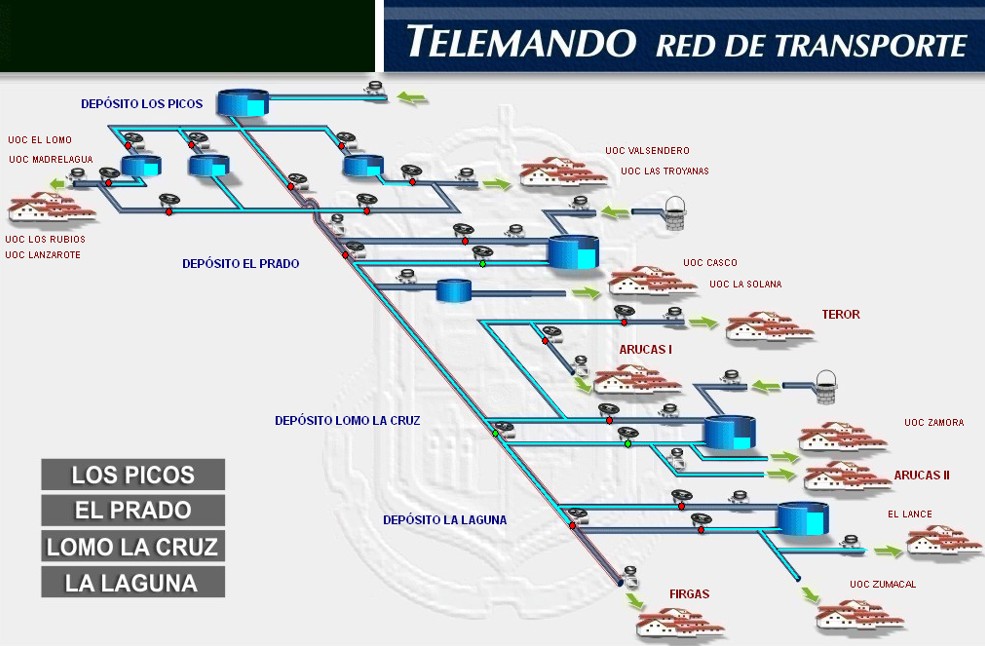 TRAMA CANARIAS diseñó e implementó un sistema de telemando a medida para toda la red de transporte. Como se puede observar en los esquemas del sistema, nuestra solución permite un control visual e intuitivo de toda la infraestructura hidráulica.